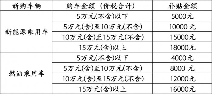 按《通知》要求,新補(bǔ)貼標(biāo)準(zhǔn)分為四檔。新購(gòu)車輛為新能源乘用車的,發(fā)票金額在5萬元(不含)以下,每輛車補(bǔ)貼5000元;5萬元(含)至10萬元(不含),每輛車補(bǔ)貼10000元;10萬元(含)至15萬元(不含),每輛車補(bǔ)貼15000元;15萬元(含)以上,每輛車補(bǔ)貼18000元。新購(gòu)車輛為燃油乘用車的,5萬元(不含)以下,每輛車補(bǔ)貼4000元;5萬元(含)至10萬元(不含),每輛車補(bǔ)貼8000元;10萬元(含)至15萬元(不含),每輛車補(bǔ)貼12000元;15萬元(含)以上,每輛車補(bǔ)貼16000元。