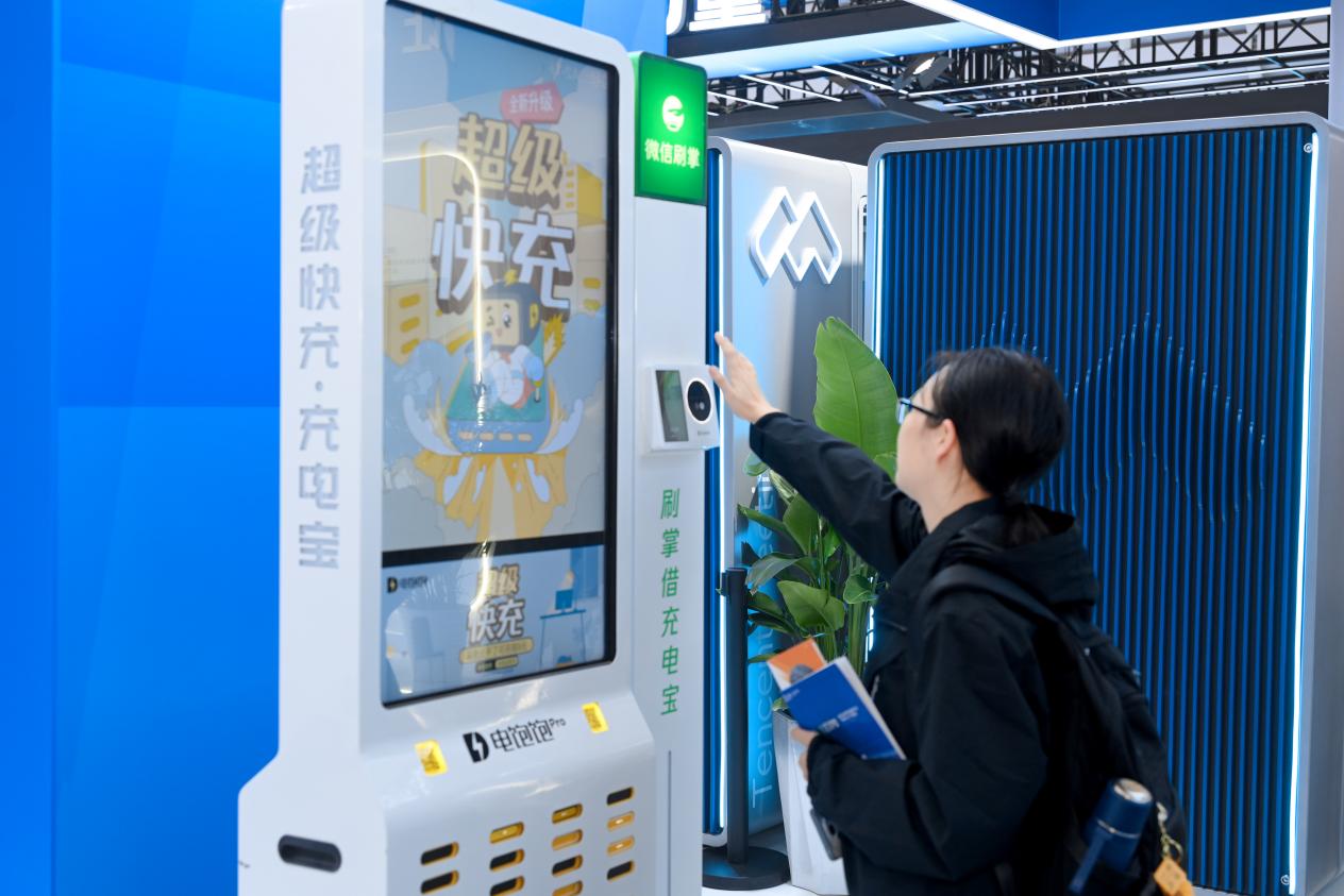 圖為參觀者體驗(yàn)刷掌借充電寶