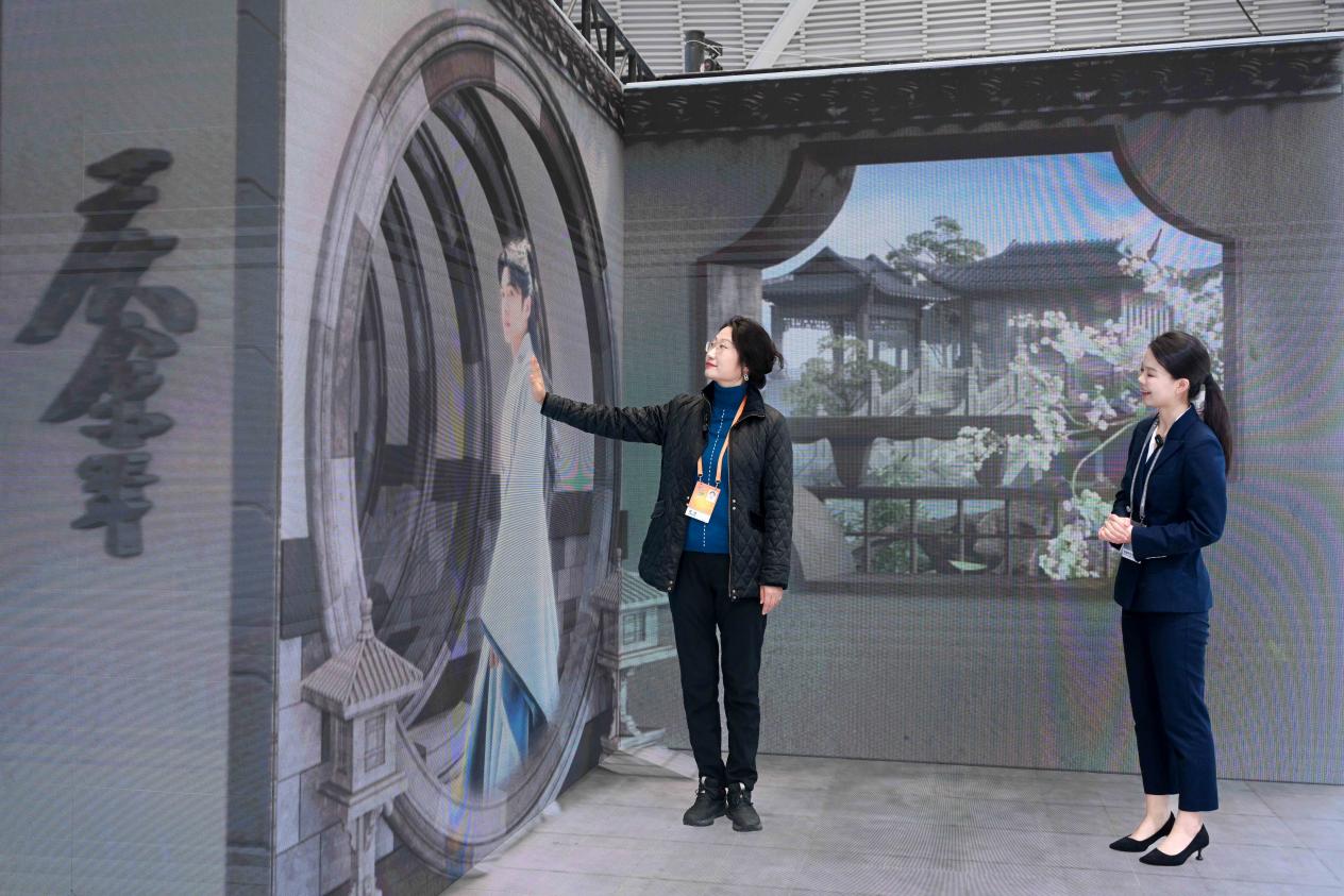 文化板塊,是騰訊本次展會(huì)的一大亮點(diǎn)。在“騰訊文化IP盒子”中,集合騰訊文學(xué)、影視、音樂(lè)、游戲、電競(jìng)、動(dòng)漫六大板塊的文化產(chǎn)業(yè)集群躍然眼前。在以裸眼3D模式呈現(xiàn)的三面屏中,觀眾可以一覽騰訊文化產(chǎn)業(yè)的全球布局,走入《慶余年》《繁花》等IP經(jīng)典場(chǎng)景中進(jìn)行合影,并通過(guò)現(xiàn)場(chǎng)設(shè)置的AI智能體,與劇中的虛擬角色實(shí)時(shí)語(yǔ)音互動(dòng)。
