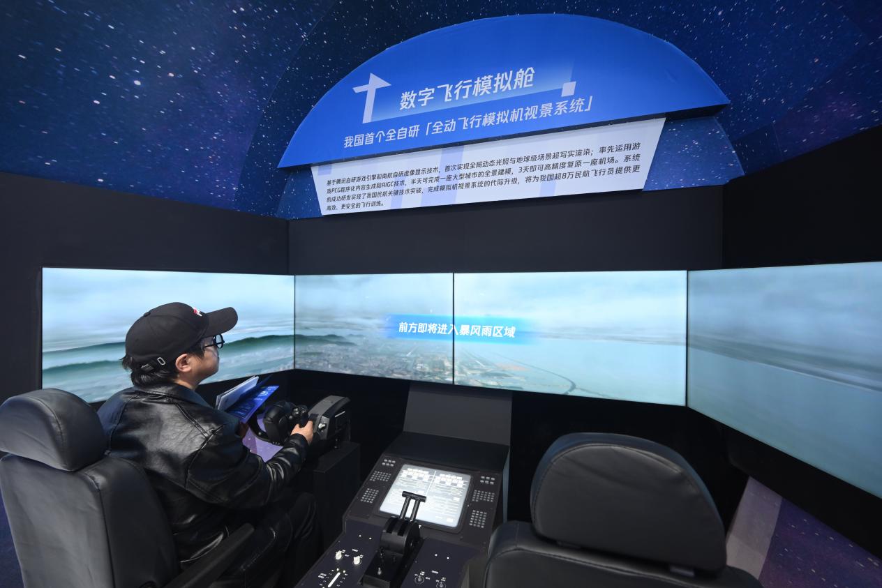 “只需要推動(dòng)操縱桿,就能操作系統(tǒng),體驗(yàn)民航飛行員第一視角下、擬真的訓(xùn)練場(chǎng)景……”在展區(qū)前方,由南航自研虛像顯示技術(shù)和騰訊自研游戲引擎技術(shù)共同打造的全動(dòng)飛行模擬機(jī)視景系統(tǒng),吸引眾多參觀者體驗(yàn)?;隍v訊自研游戲引擎,系統(tǒng)首次實(shí)現(xiàn)全局動(dòng)態(tài)光照與地球級(jí)場(chǎng)景超寫實(shí)渲染,多邊形生成面數(shù)較之前提升380倍、貼圖精細(xì)度提升100倍,助力實(shí)現(xiàn)我國(guó)民航關(guān)鍵技術(shù)突破。