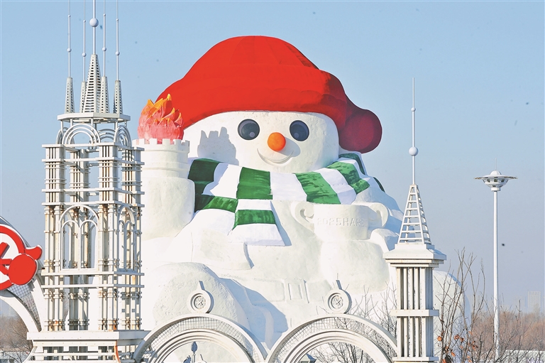 近日,哈爾濱市道里區(qū)群力江畔雪人碼頭,23米高的大雪人主體已經(jīng)完成,工人正在進(jìn)行收尾工作。這座大雪人頭戴紅帽子,圍著白綠相間的圍脖,手里舉著火炬,十分可愛(ài),吸引了許多游客和市民前來(lái)觀(guān)看。