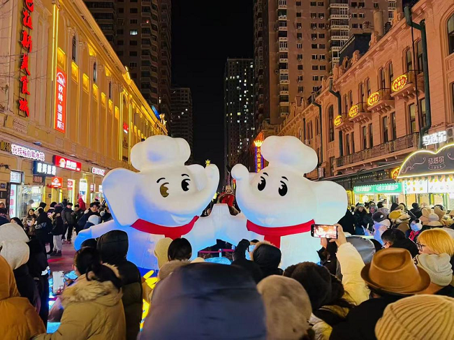 除了“白象”標志性小象IP格外吸睛之外,因其與“對象”諧音的巧妙設(shè)計,也吸引著往來行人紛紛駐足。雪雕前人潮涌動,不少市民游客在“對象”前合影留念。這一創(chuàng)意不僅為游客增添別樣的溫暖與歡樂,也在社交媒體掀起一陣“找對象”的熱潮?;顒悠陂g,“對象雪雕走紅哈爾濱”的話題登上熱搜榜。不少網(wǎng)友調(diào)侃:“這就去哈爾濱找對象?!币灿腥吮硎荆赐晷∠笱┑?,感覺爾濱的冬天都充滿了浪漫的氣息。