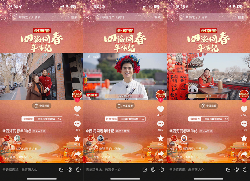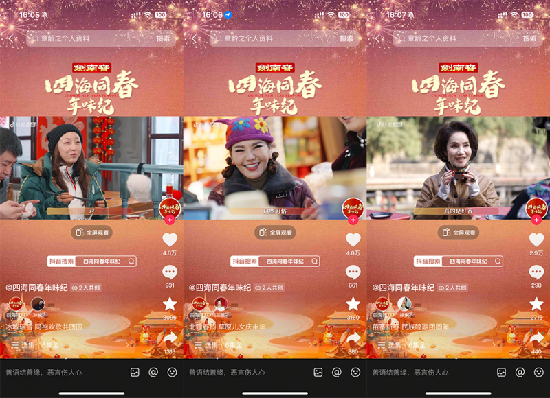 為紀(jì)念首個(gè)“非遺版春節(jié)”,由抖音出品、中國(guó)名酒劍南春冠名的春節(jié)主題紀(jì)錄片《四海同春年味紀(jì)》邀請(qǐng)多位明星來(lái)到家鄉(xiāng)或向往的城市,體驗(yàn)當(dāng)?shù)靥厣晡丁<o(jì)錄片于1月22日-1月27日,通過(guò)抖音、抖音精選、今日頭條、西瓜視頻、鮮時(shí)光等平臺(tái)播出。截至收官,該片正片播放量超1億,抖音話題播放量破2.3億,全網(wǎng)曝光達(dá)10億,相關(guān)話題多次登上平臺(tái)熱榜。