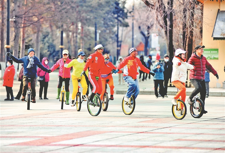 在哈爾濱市江畔斯大林公園內(nèi)的小廣場上,許多人在練習(xí)騎獨(dú)輪車。在樹林旁,數(shù)十位老年人在跳民族舞。公園的人行道上,不時(shí)有成群的徒步者走過。