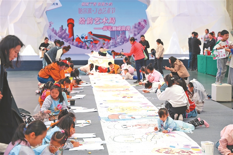 1日,“傾城丁香·浪漫之約”2025哈爾濱丁香藝術(shù)周在西城紅場美術(shù)館啟幕。圖為少兒丁香主題繪畫活動。