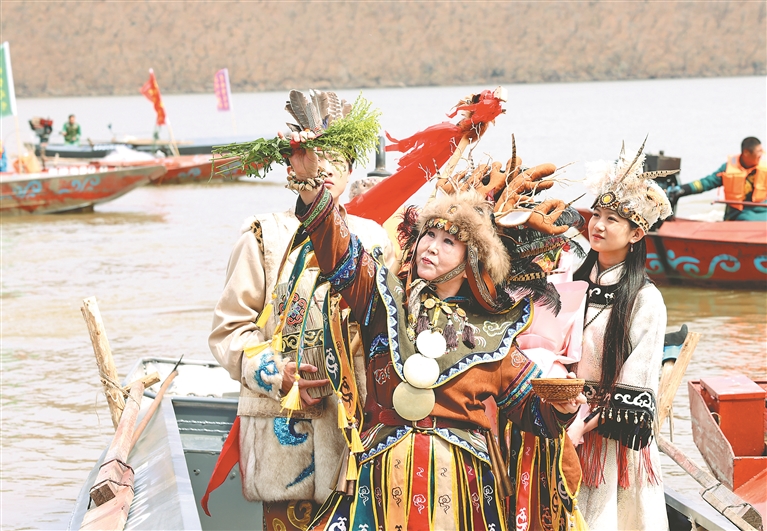1日,饒河縣第十三屆烏蘇里江開(kāi)江文化節(jié)在四排赫哲族鄉(xiāng)開(kāi)幕。圖為船頭祈福。