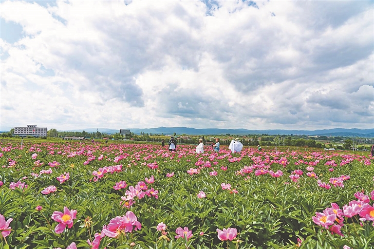 紫云嶺花海將自然美景與人文內(nèi)涵深度融合,游客賞花之余,還可通過景區(qū)設置的展板了解芍藥歷史,感受“以花傳情”的東方浪漫。圖為絢爛綻放的芍藥花。