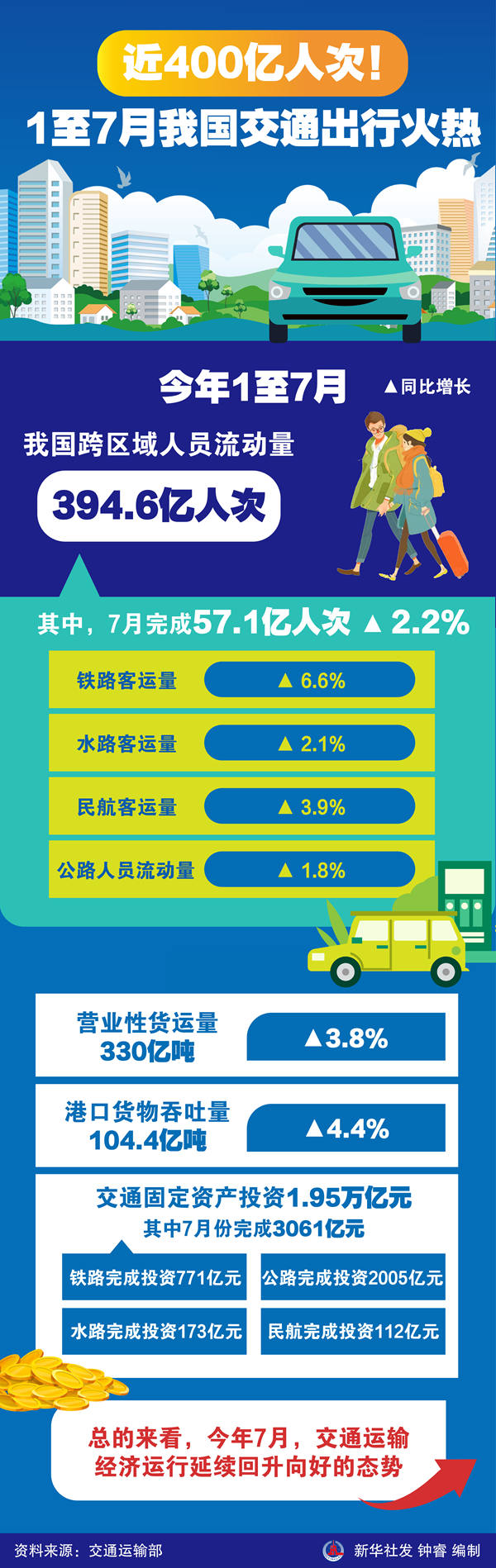 “7月份,完成跨區(qū)域人員流動(dòng)量57.1億人次,同比增長(zhǎng)2.2%,增速較上月回升0.7個(gè)百分點(diǎn)。分方式看,鐵路、水路、民航客運(yùn)量同比分別增長(zhǎng)6.6%、2.1%和3.9%,公路人員流動(dòng)量同比增長(zhǎng)1.8%?!苯煌ㄟ\(yùn)輸部新聞發(fā)言人李穎說(shuō)。