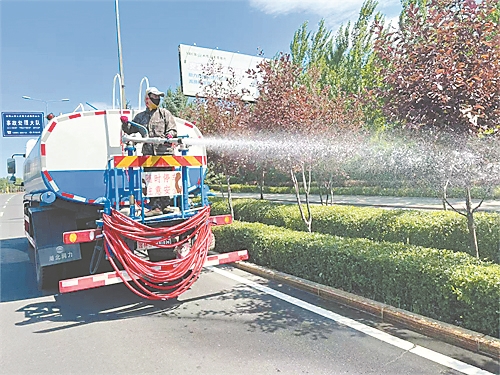 灑水車在澆灌綠植。張涵攝