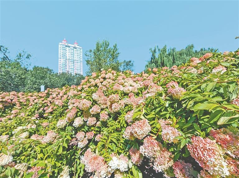 10日,哈爾濱市南崗區(qū)馬家溝畔,市民在紅色的繡球花旁拍照。