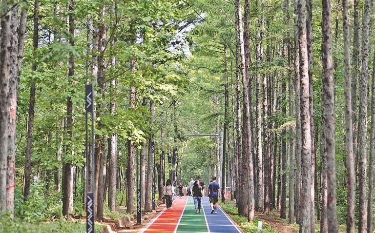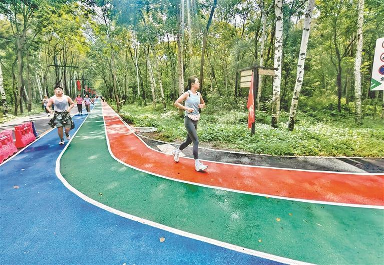 一位在這里跑步的附近居民說,林間空氣清新,負(fù)氧離子含量高,對人體有很大益處。一邊跑步健身,一邊觀賞林間美景,感覺舒服又愜意。