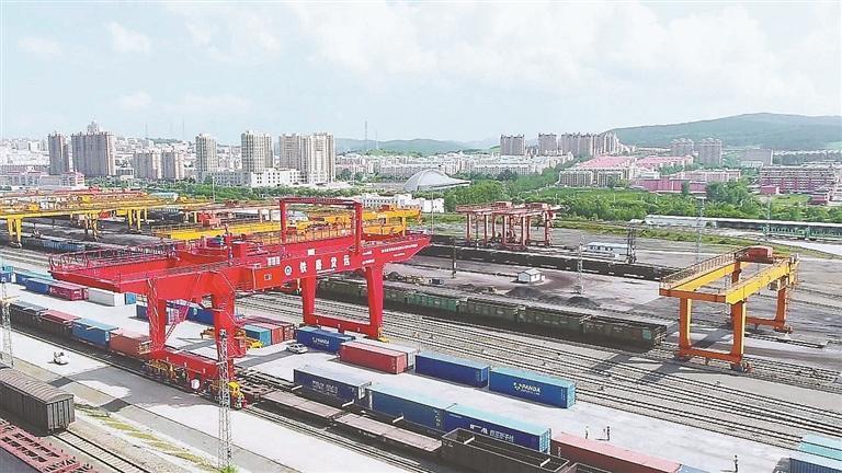 6日上午,百年口岸綏芬河鐵路車(chē)站換裝貨場(chǎng)內(nèi),塔吊在高效有序地對(duì)進(jìn)出境貨運(yùn)列車(chē)進(jìn)行著換裝作業(yè)。