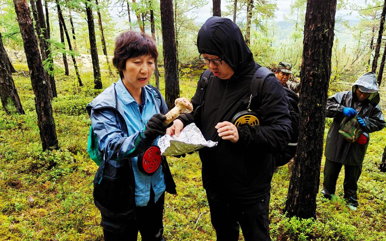 東北林業(yè)大學(xué)鄒莉教授(左)查看長(zhǎng)山林場(chǎng)野生松茸生長(zhǎng)情況(王力 攝)