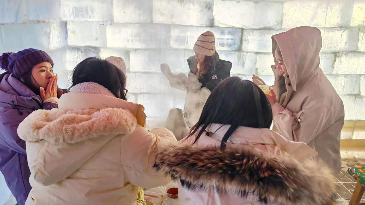 最受游客追捧的冰屋火鍋體驗(yàn),今年在味覺(jué)與感官雙重享受上再升級(jí)。冰屋內(nèi)溫度保持在零下30℃左右,卻絲毫不影響食客們的熱情,80個(gè)餐位時(shí)常座無(wú)虛席。林場(chǎng)精選大興安嶺本地鮮切羊肉、林下鮮蔬等特色食材,搭配地道東北銅鍋炭火,讓游客在極寒環(huán)境中品味熱辣鮮香,“冰火兩重天”的極致體驗(yàn)直擊味蕾與身心。