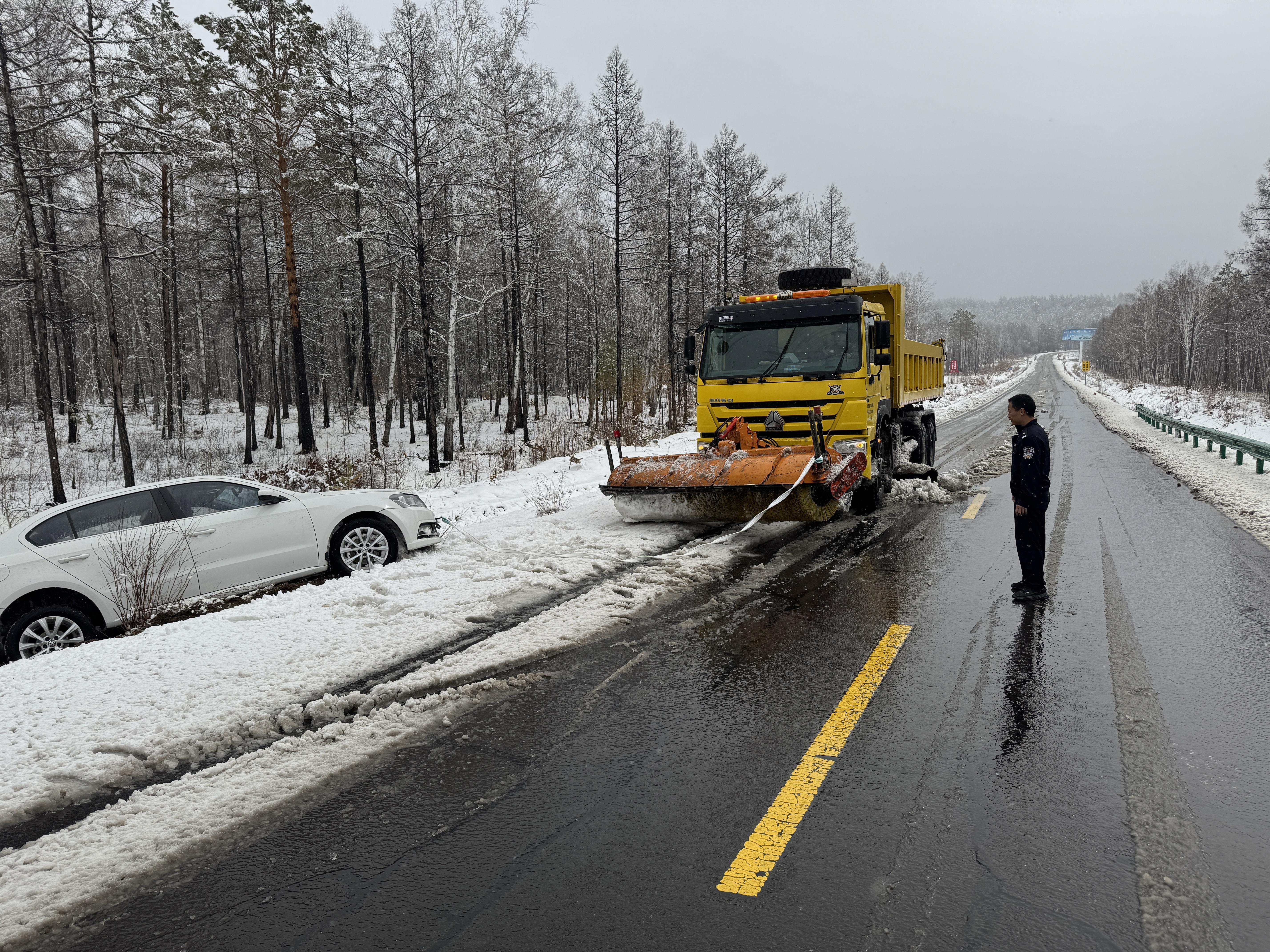民輔警第一時間在車輛周邊設(shè)置安全警示標(biāo)志,避免發(fā)生二次事故,隨后徒手清理車輪周邊積雪,積極聯(lián)系救援車輛,合力對被困車輛實施救援。經(jīng)過半小時的緊張奮戰(zhàn),成功將被困車輛安全移出溝渠。